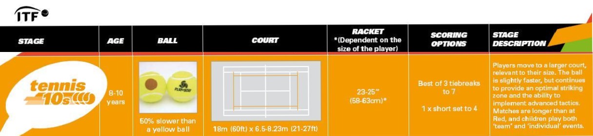 The players progress from the RED ball group to the ORANGE ball group. At this stage of learning, players move beyond the basics to focussing on the mastery of the basic techniques